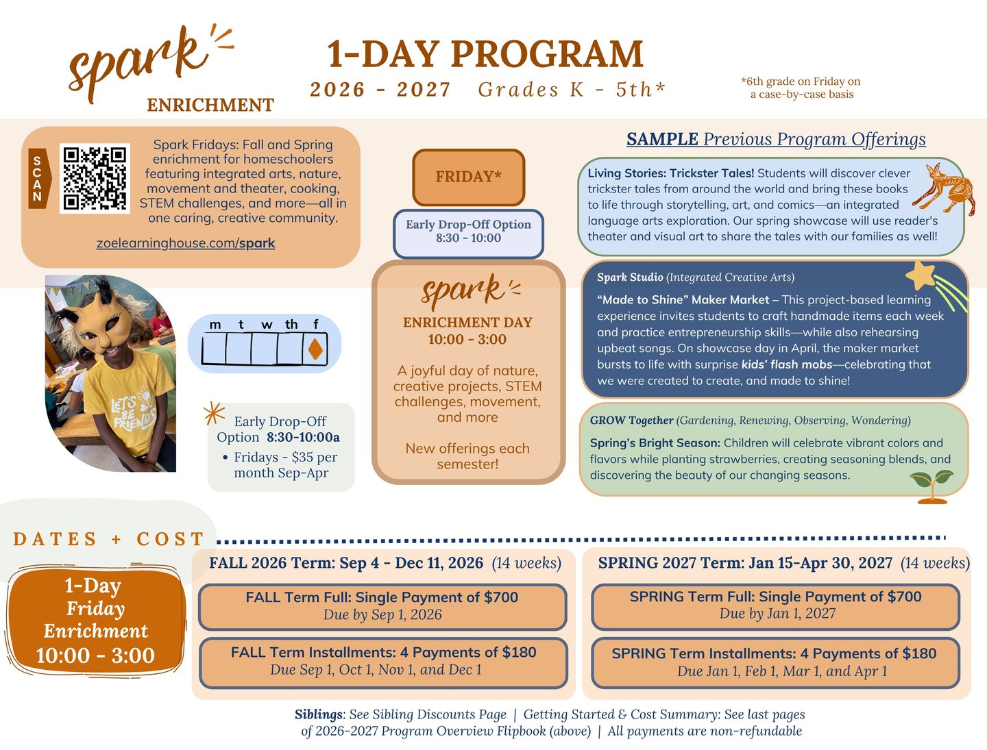 Spark Fridays: Fall and Spring enrichment for homeschoolers featuring integrated arts, nature, movement and theater, cooking, STEM challenges, and more—all in one caring, creative community.