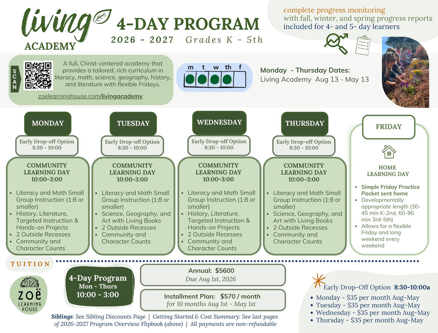 Our four-day Living Academy takes place Monday-Thursday, and provides a full curriculum of tailored instruction, creative projects, and ongoing progress monitoring to ensure your child thrives academically and holistically. Fridays are kept flexible for rest and family life with a simple Friday Practice Packet.