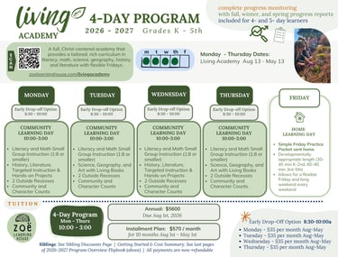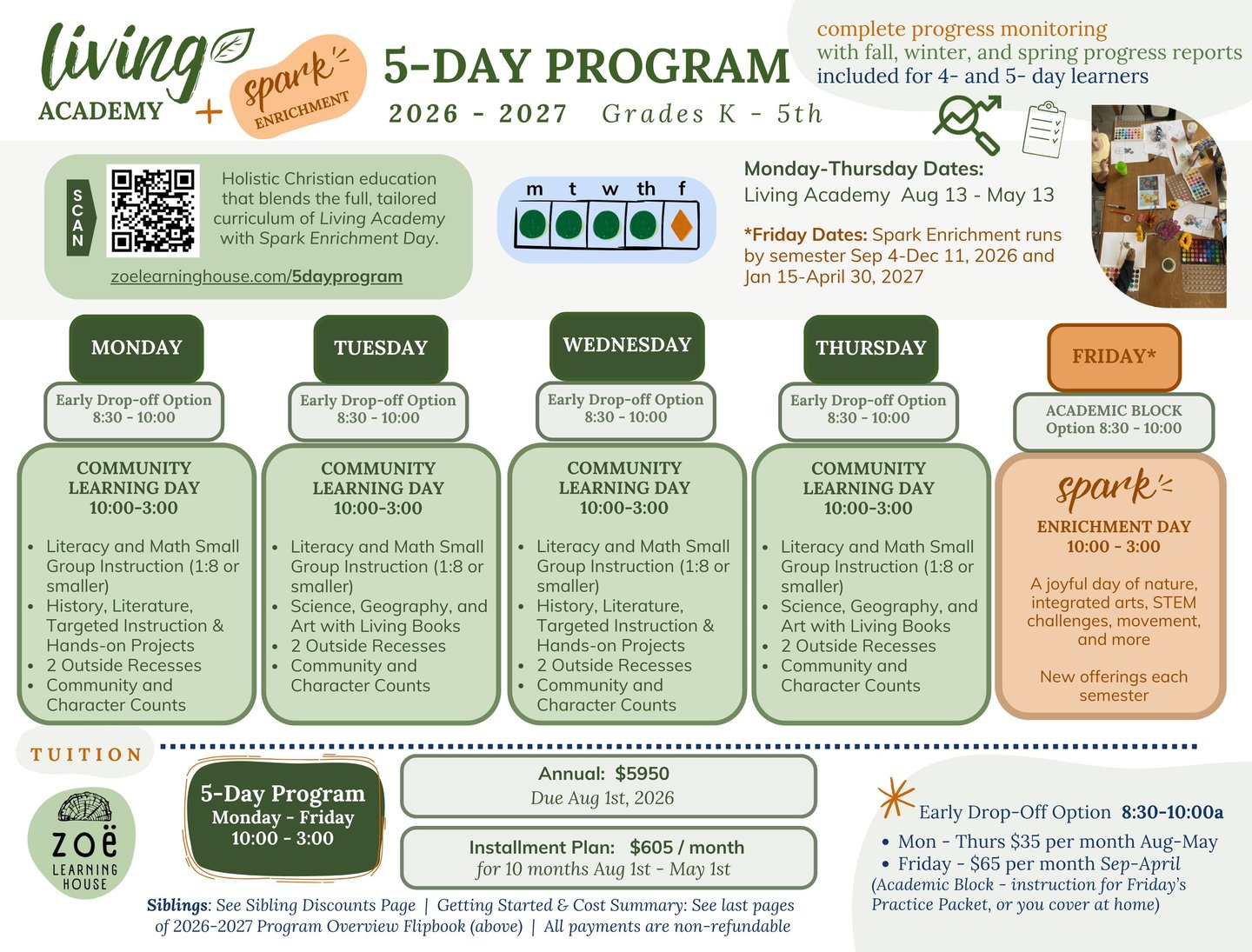 Our 5-Day Program combines Living Academy's full academics with our creative Spark Enrichment day—giving your child tailored, Christ-centered education, extended time outdoors, and joyful community all week long.