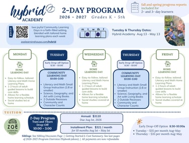 Our 2-Day Hybrid Academy gives your family a supportive balance of community learning and homeschool flexibility. Your child joins us Tuesdays and Thursdays for joyful, hands-on instruction in literacy, math, science, and geography—while you maintain the freedom to homeschool the rest of the week. We provide easy-to-follow Weekly Learning Plans to guide your home learning days, so you can feel confident your child is thriving academically while enjoying the part-time schedule that works best for your family.