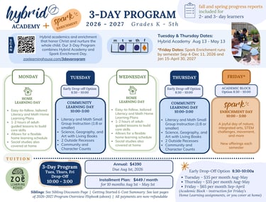 Our 3-Day Program combines Hybrid Academy's hybrid academics with our creative Spark Enrichment day—giving your child three days of joyful community learning and creative classes all in one place. You still maintain homeschool flexibility for the remainder of your week, with easy-to-follow Weekly Learning Plans provided to guide your home learning days.
